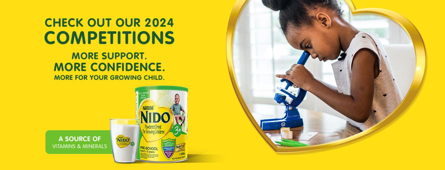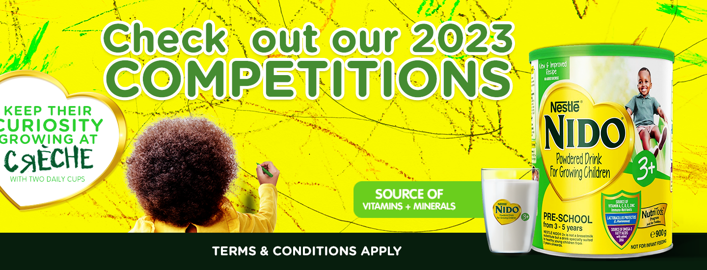 To participate in this Campaign, you must sign up for exclusive NESTLÉ® NIDO® 3+ content on Facebook or YouTube. In doing so, you stand a chance to win a prize (details below). Note: on Facebook you will be directed to a form that you need to complete with your details, and on YouTube you will be redirected to the website sign up page on https://www.nidokids.co.za. For all queries, please call Nestlé Call Centre on 011 514 6116 or 086 009 6116 between 09h00 - 16h30 Monday to Friday.